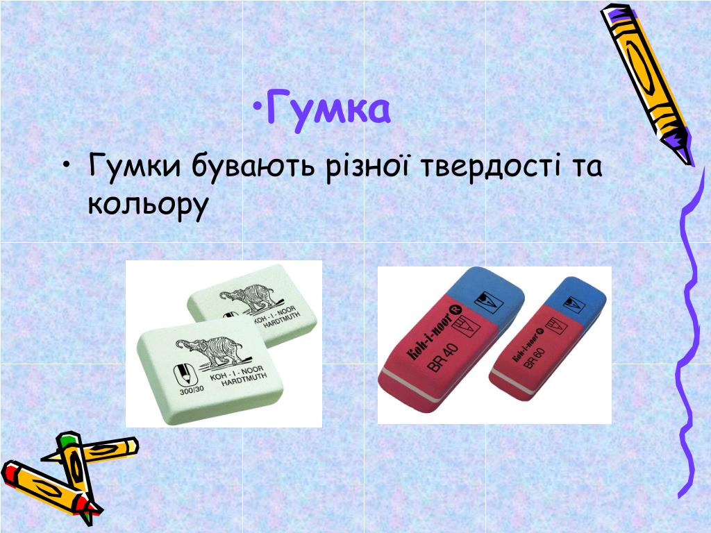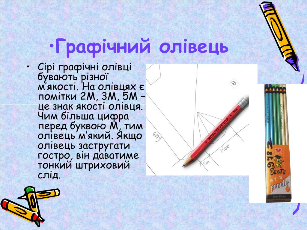 Сірі графічні олівці бувають різної м’якості. На олівцях є помітки 2М, 3М, 5М – це знак якості олівця. Чим більша цифра перед буквою М, тим олівець м’який. Якщо олівець застругати гостро, він даватиме тонкий штриховий слід. Графічний олівець