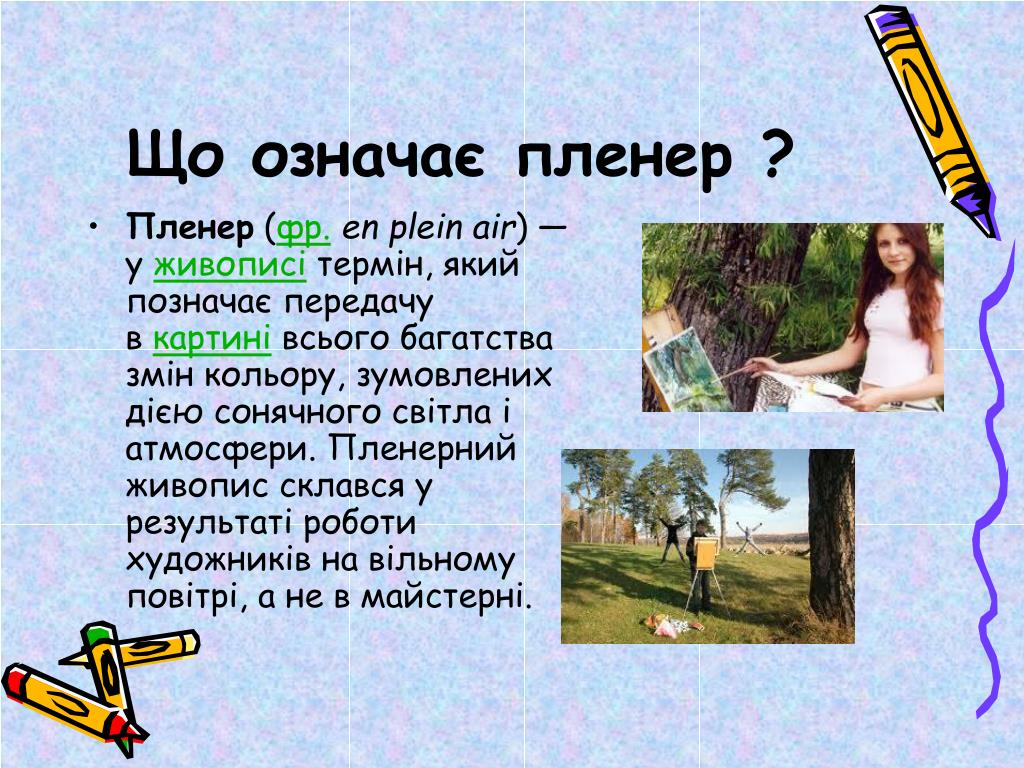 Пленер(фр.en plein air)— уживописітермін, який позначає передачу вкартинівсього багатства змін кольору, зумовлених дією сонячного світла і атмосфери. Пленерний живопис склався у результаті роботи художників на вільному повітрі, а не в майстерні. Що означає пленер ?