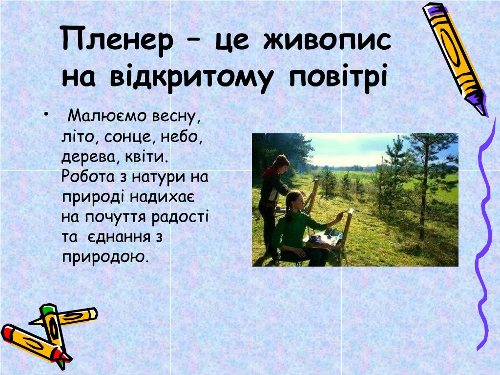 Малюємо весну, літо, сонце, небо, дерева, квіти. Робота з натури на природі надихає на почуття радості та єднання з природою. Пленер – це живопис на відкритому повітрі