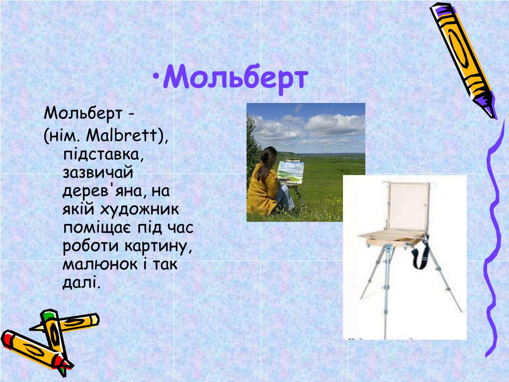 Мольберт - (нім. Malbrett), підставка, зазвичай дерев'яна, на якій художник поміщає під час роботи картину, малюнок і так далі. Мольберт