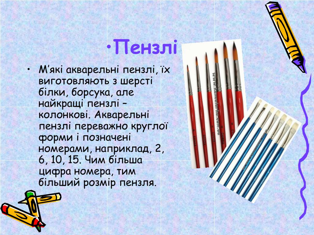 М’які акварельні пензлі, їх виготовляють з шерсті білки, борсука, але найкращі пензлі – колонкові. Акварельні пензлі переважно круглої форми і позначені номерами, наприклад, 2, 6, 10, 15. Чим більша цифра номера, тим більший розмір пензля. Пензлі