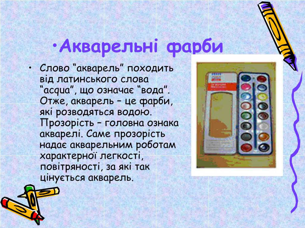 Слово “акварель” походить від латинського слова “асqua”, що означає “вода”. Отже, акварель – це фарби, які розводяться водою. Прозорість – головна ознака акварелі. Саме прозорість надає акварельним роботам характерної легкості, повітряності, за які так цінується акварель. Акварельні фарби