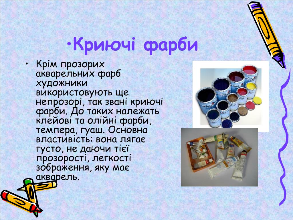 Крім прозорих акварельних фарб художники використовують ще непрозорі, так звані криючі фарби. До таких належать клейові та олійні фарби, темпера, гуаш. Основна властивість: вона лягає густо, не даючи тієї прозорості, легкості зображення, яку має акварель. Криючі фарби