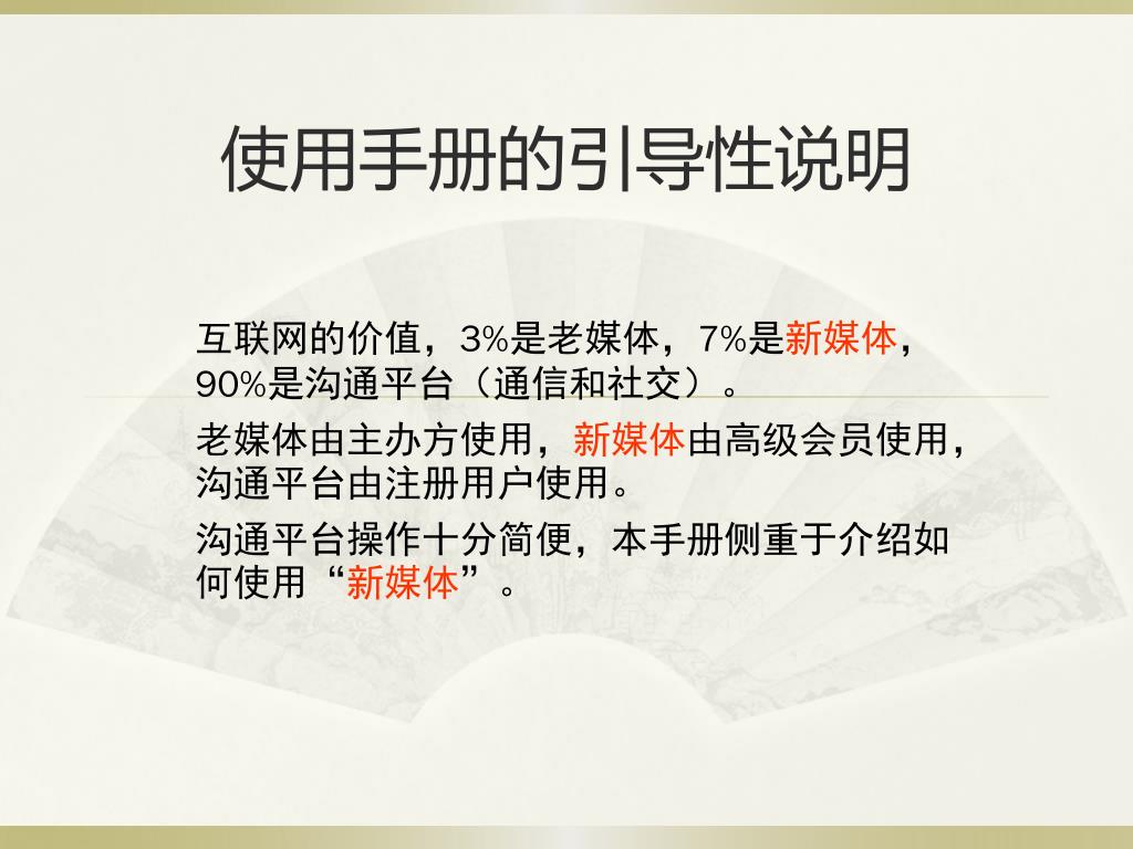 使用手册的引导性说明 互联网的价值,3%是老媒体,7%是新媒体,90%是沟通平台(通信和社交)。 老媒体由主办方使用,新媒体由高级会员使用,沟通平台由注册用户使用。 沟通平台操作十分简便,本手册侧重于介绍如何使用“新媒体”。