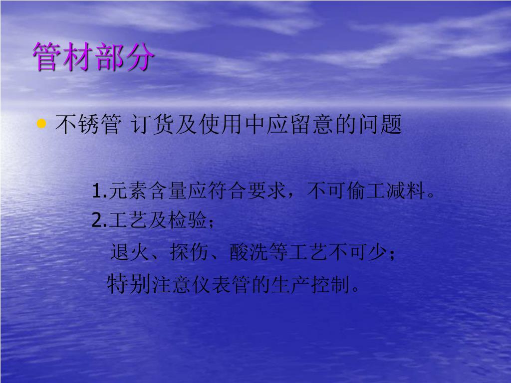 管材部分 • 不锈管 订货及使用中应留意的问题 1.元素含量应符合要求,不可偷工减料。 2.工艺及检验; 退火、探伤、酸洗等工艺不可少; 特别注意仪表管的生产控制。