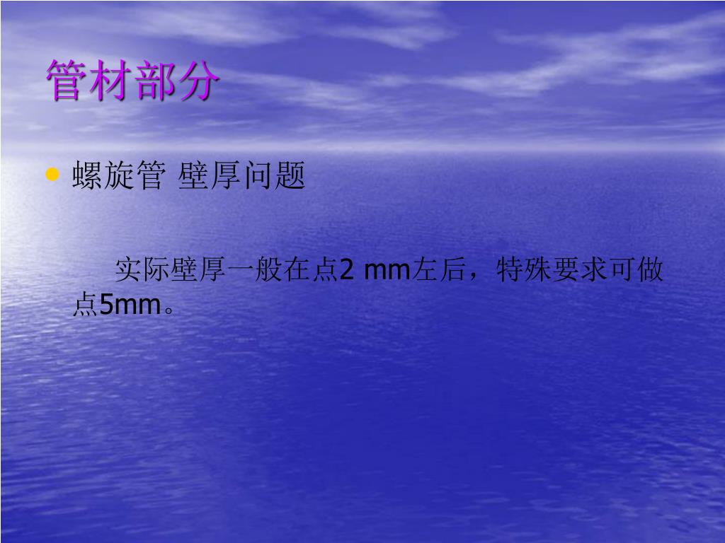 管材部分 • 螺旋管 壁厚问题 实际壁厚一般在点2 mm左后,特殊要求可做点5mm。