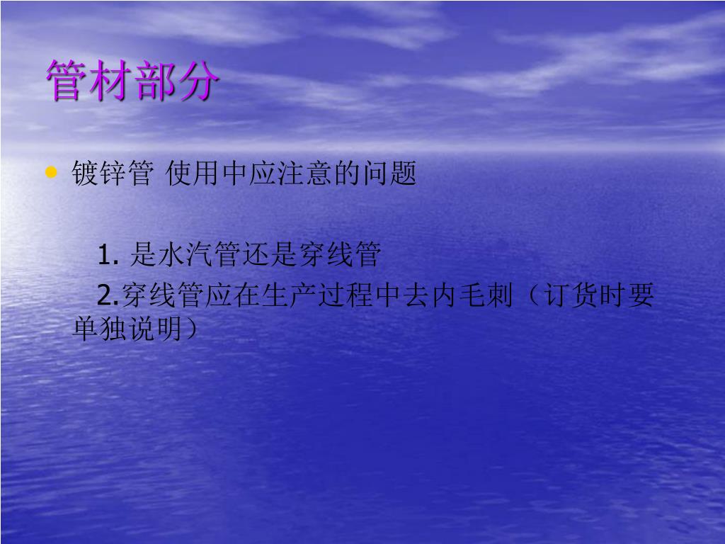管材部分 • 镀锌管 使用中应注意的问题 1. 是水汽管还是穿线管 2.穿线管应在生产过程中去内毛刺(订货时要 单独说明)