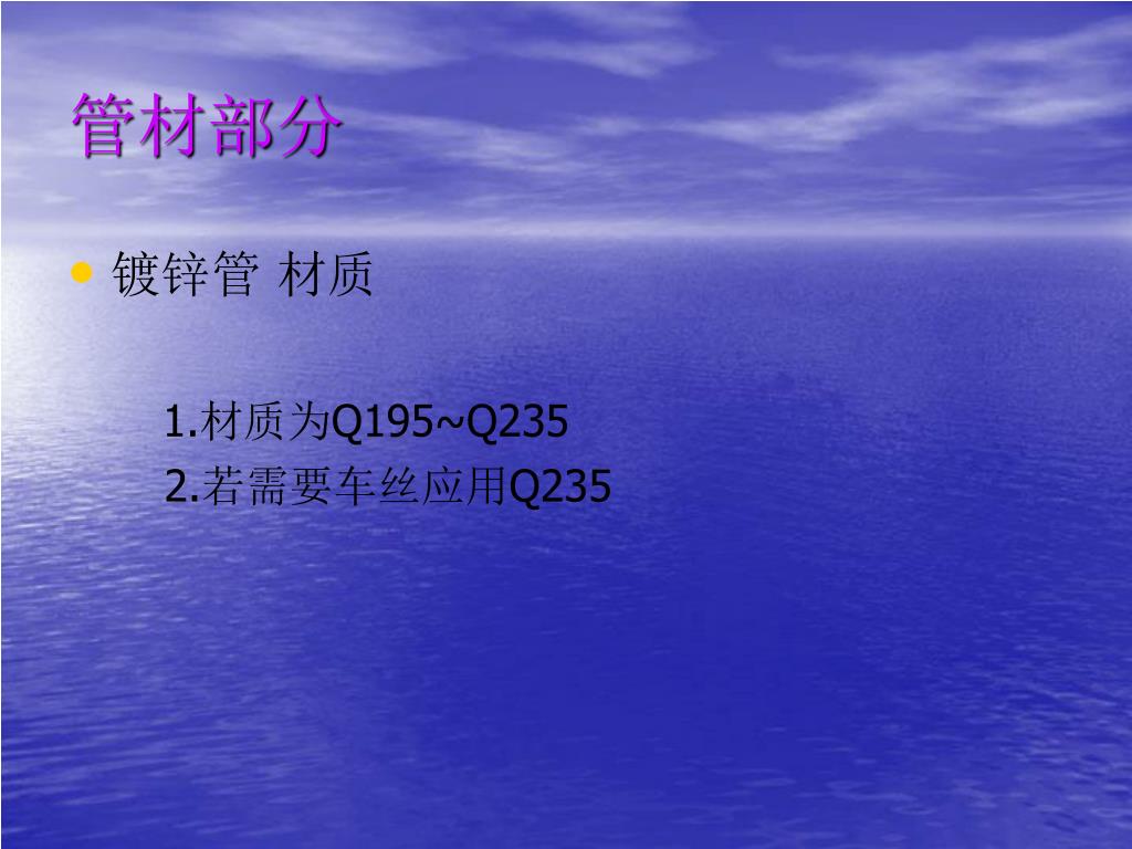 管材部分 • 镀锌管 材质 1.材质为Q195~Q235 2.若需要车丝应用Q235