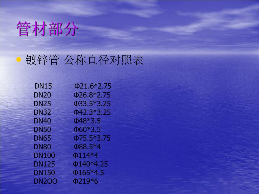 管材部分 • 镀锌管 公称直径对照表 DN15 Φ21.6*2.75 DN20 Φ26.8*2.75 DN25 Φ33.5*3.25 DN32 Φ42.3*3.25 DN40 Φ48*3.5 DN50 Φ60*3.5 DN65 Φ75.5*3.75 DN80 Φ88.5*4 DN100 Φ114*4 DN125 Φ140*4.25 DN150 Φ165*4.5 DN2OO Φ219*6