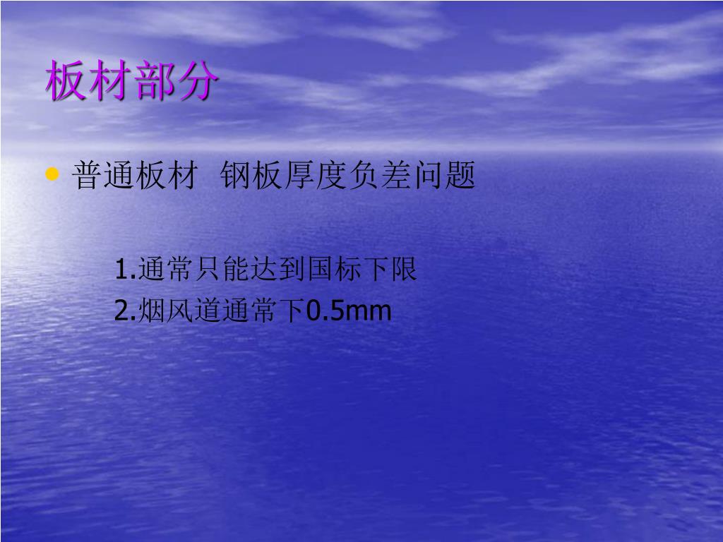 板材部分 • 普通板材 钢板厚度负差问题 1.通常只能达到国标下限 2.烟风道通常下0.5mm