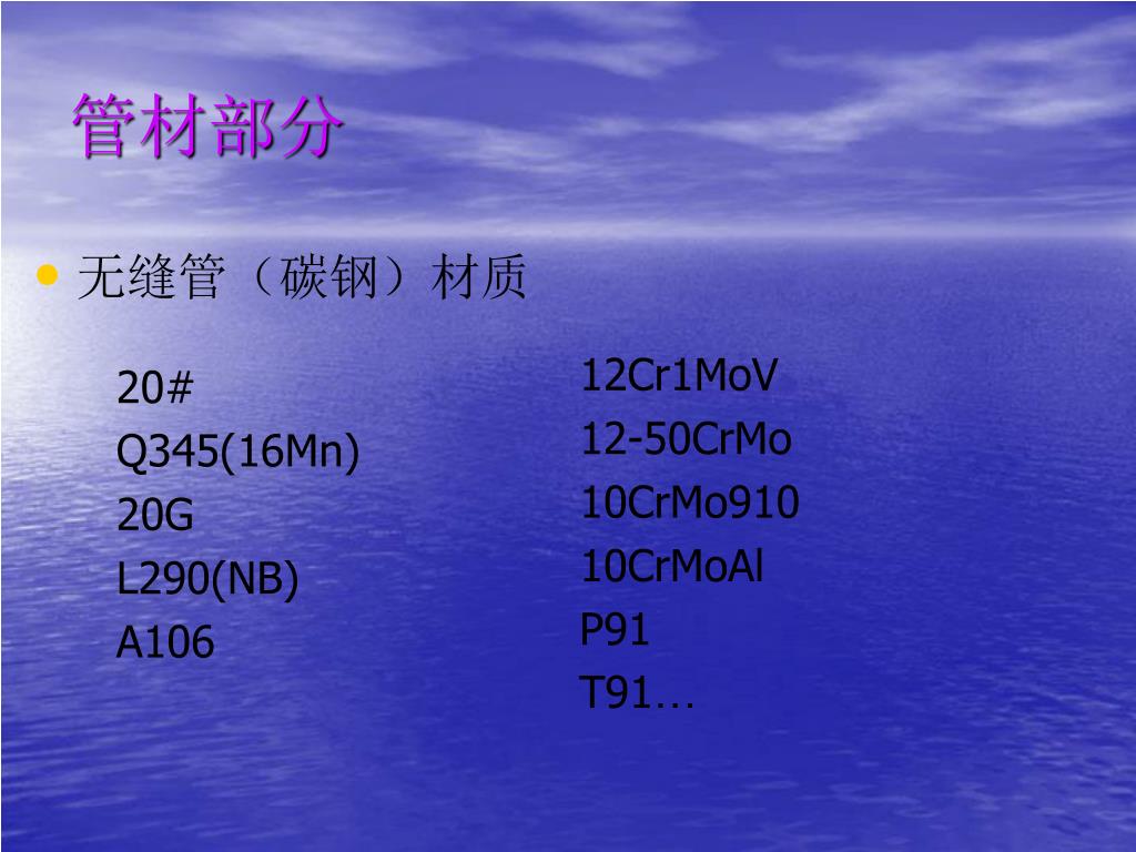 交流与分享. 交流单位 : 武汉中兴电通科贸有限公司 2011.2.20. 电厂主材供应中须注意的几个问题. 管材 板材 型材. 管材部分. 无缝管(碳钢) 标准 GB8162-2008 GB8163-2008 GB3087-2008 GB5310-1995. 无缝管(碳钢)材质 20# Q345(16Mn) 20G L290(NB) A106. 12Cr1MoV 12-50CrMo 10CrMo910 10CrMoAl P91