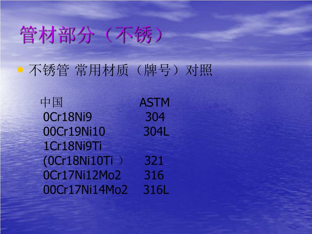 管材部分(不锈) • 不锈管 常用材质(牌号)对照 中国 ASTM 0Cr18Ni9 304 00Cr19Ni10 304L 1Cr18Ni9Ti (0Cr18Ni10Ti ) 321 0Cr17Ni12Mo2 316 00Cr17Ni14Mo2 316L