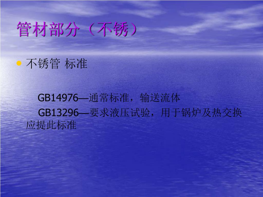 管材部分(不锈) • 不锈管 标准 GB14976—通常标准,输送流体 GB13296—要求液压试验,用于锅炉及热交换应提此标准