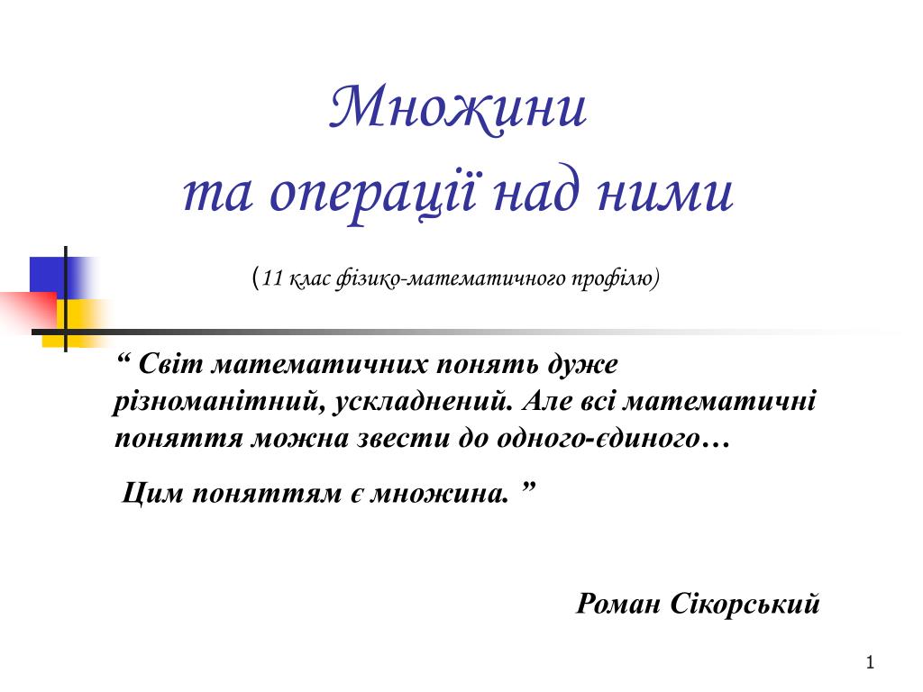 Множини та операції над ними(11 клас фізико-математичного профілю) “ Світ математичних понять дуже різноманітний, ускладнений. Але всі математичні поняття можна звести до одного-єдиного… Цим поняттям є множина. ” Роман Сікорський