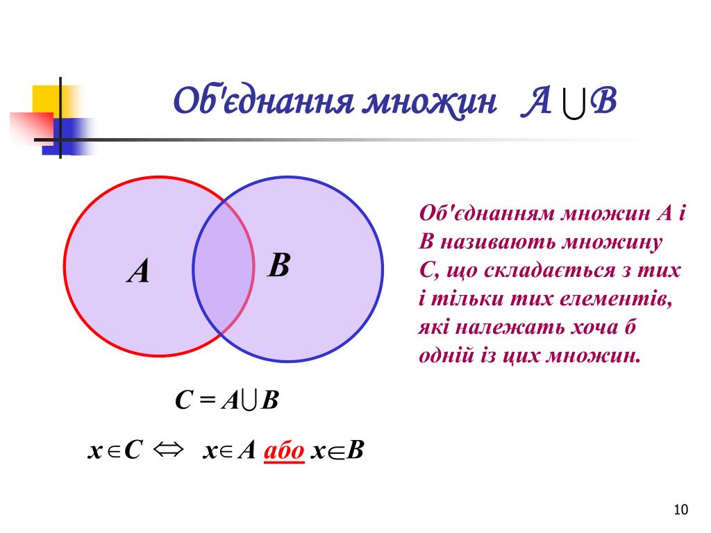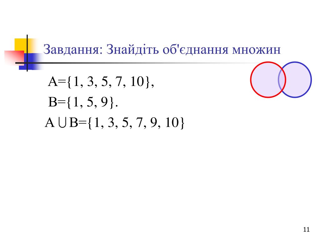 Завдання: Знайдіть об'єднання множин А={1, 3, 5, 7, 10}, В={1, 5, 9}. А В={1, 3, 5, 7, 9, 10}