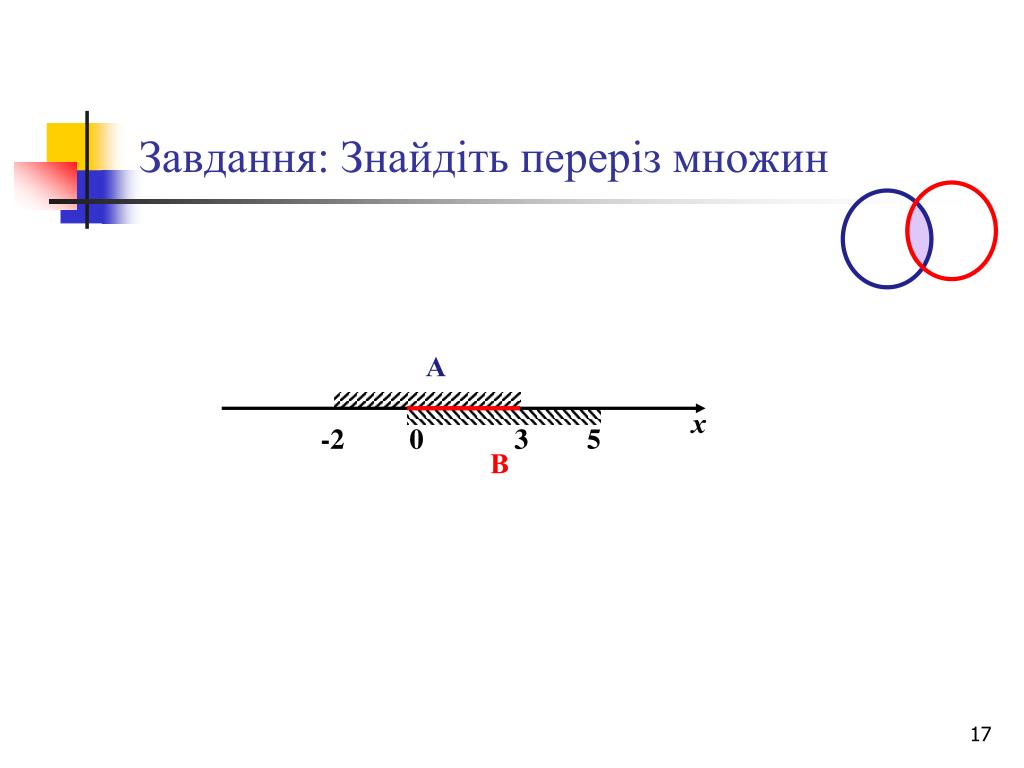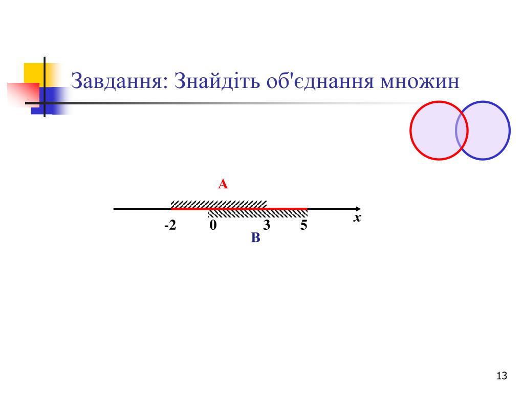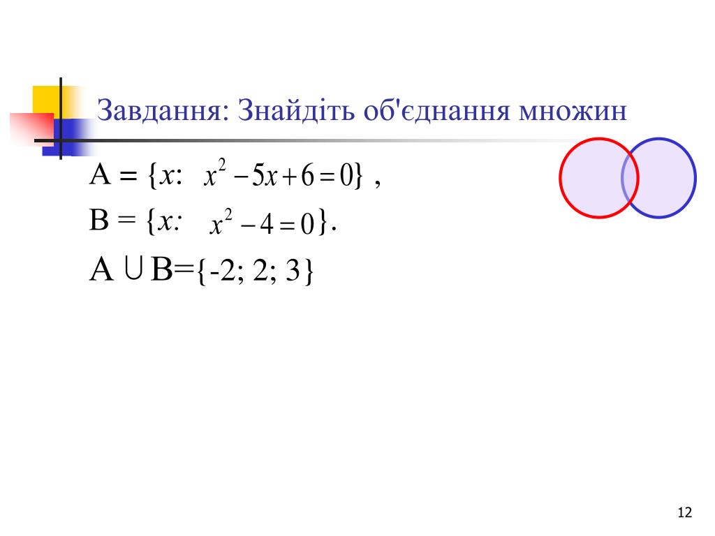 Завдання: Знайдіть об'єднання множин А = {х: } , В = {х: }. А В={-2; 2; 3}