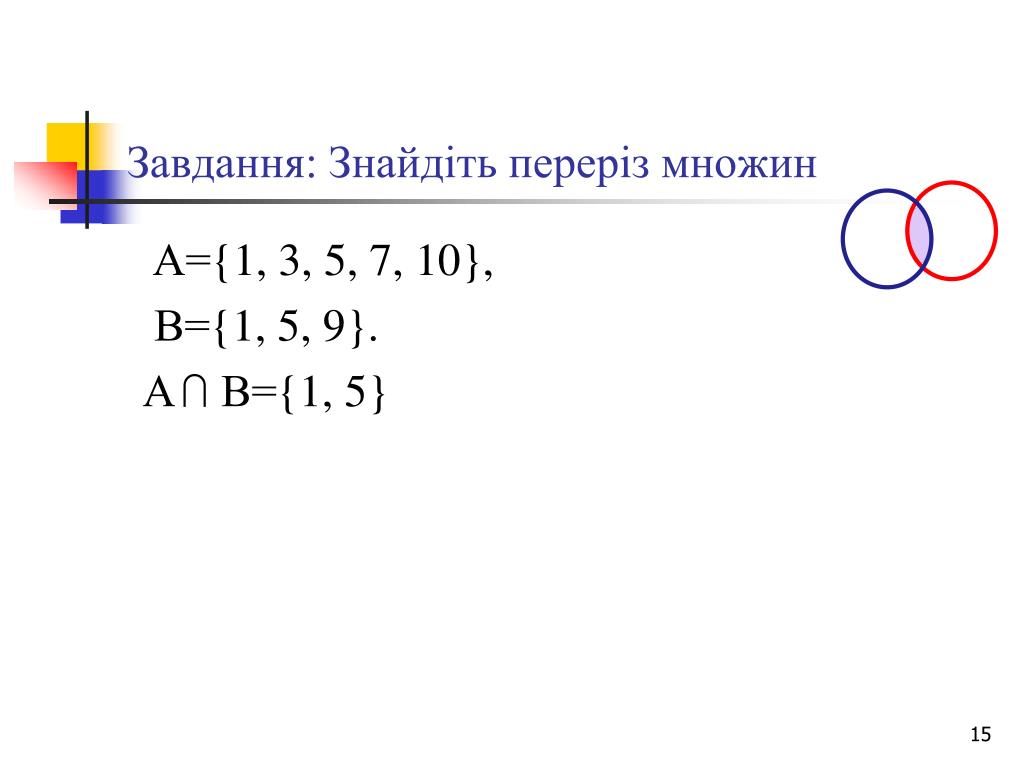 Завдання: Знайдіть переріз множин А={1, 3, 5, 7, 10}, В={1, 5, 9}. А В={1, 5}