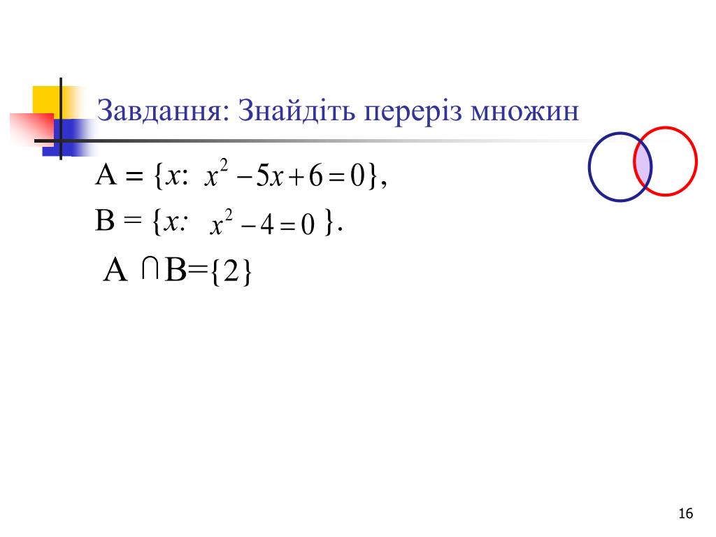Завдання: Знайдіть переріз множин А = {х: }, В = {х: }. А В={2}