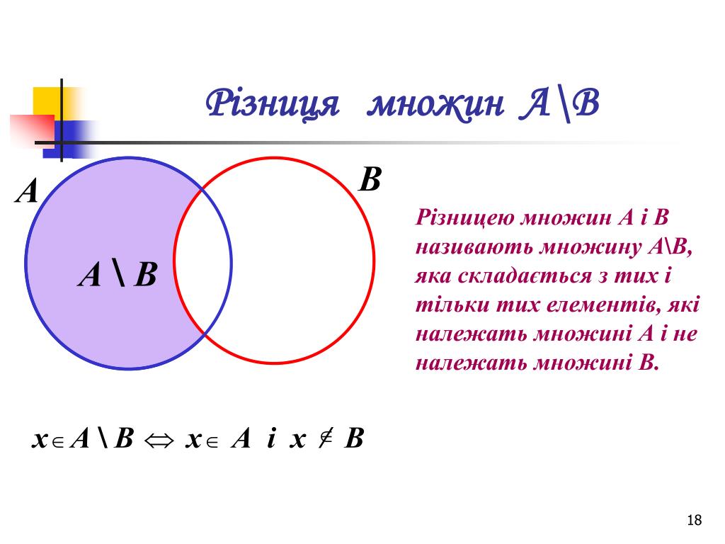 Різниця множин А\В В А Різницею множин А і В називають множину А\В, яка складається з тих і тільки тих елементів, які належать множині А і не належать множині В. А\В х А \В х А і х / В