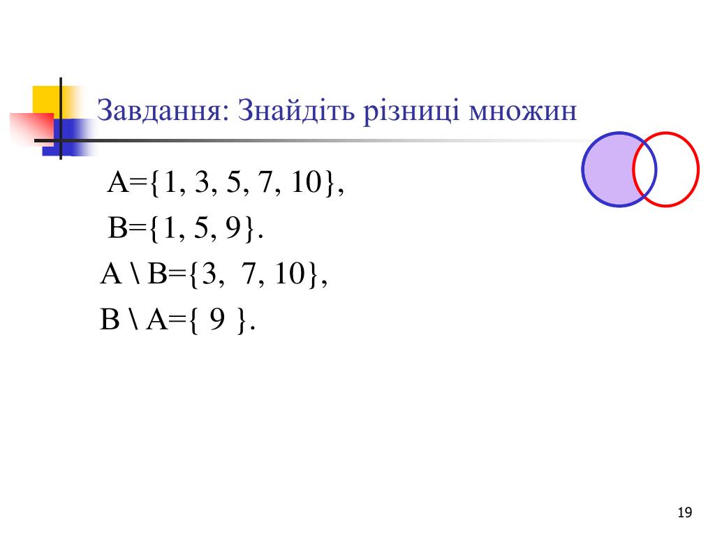 Завдання: Знайдіть різниці множин А={1, 3, 5, 7, 10}, В={1, 5, 9}. А \ В={3, 7, 10}, В \ А={ 9 }.