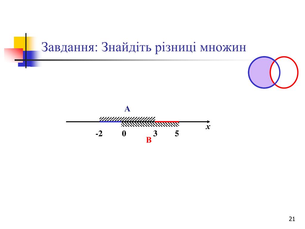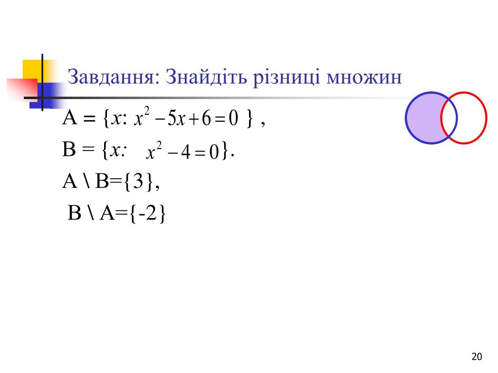 Завдання: Знайдіть різниці множин А = {х: } , В = {х: }. А \ В={3}, В \ А={-2}