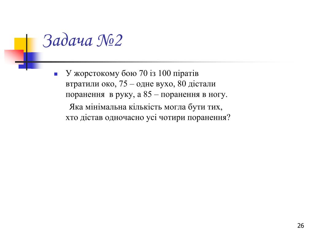 Задача №2 • У жорстокому бою 70 із 100 піратів втратили око, 75 – одне вухо, 80 дістали поранення в руку, а 85 – поранення в ногу. Яка мінімальна кількість могла бути тих, хто дістав одночасно усі чотири поранення?
