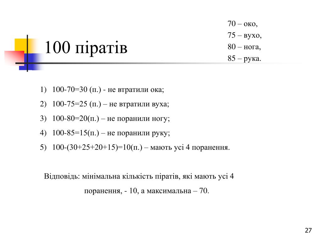 100 піратів 70 – око, 75 – вухо, 80 – нога, 85 – рука. • 100-70=30 (п.) - не втратили ока; • 100-75=25 (п.) – не втратили вуха; • 100-80=20(п.) – не поранили ногу; • 100-85=15(п.) – не поранили руку; • 100-(30+25+20+15)=10(п.) – мають усі 4 поранення. • Відповідь: мінімальна кількість піратів, які мають усі 4 • поранення, - 10, а максимальна – 70.