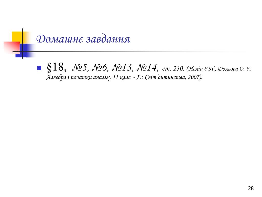 Домашнє завдання • §18, №5, №6, №13, №14,ст. 230. (Нелін Є.П., Долгова О. Є. Алгебра і початки аналізу 11 клас. - Х.: Світ дитинства, 2007).
