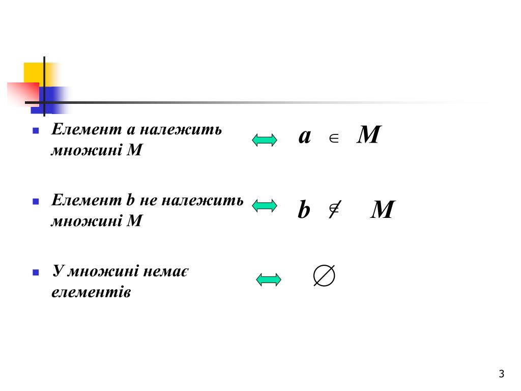 Елемент а належить множині М Елемент b не належить множині М У множині немає елементів а М b / М