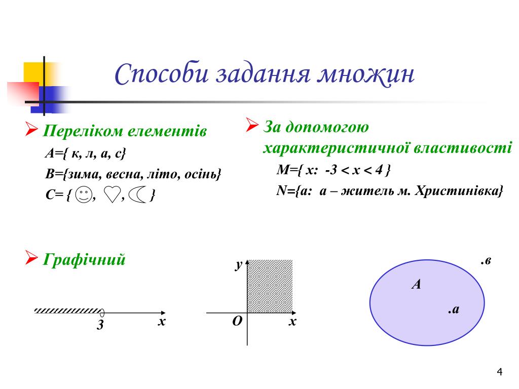 Способи задання множин • Переліком елементів А={ к, л, а, с} В={зима, весна, літо, осінь} С= { , , } • Графічний • За допомогою характеристичної властивості М={ х: -3 < х < 4 } N={а: а – житель м. Христинівка} .в у А .а х О х 3