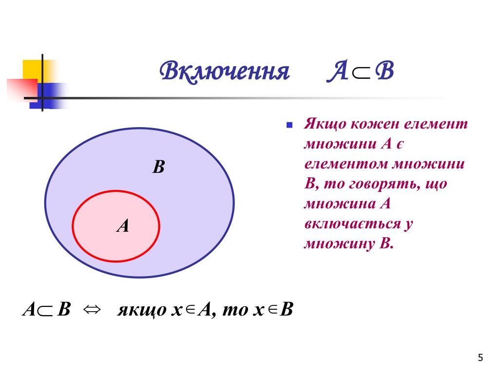 Включення А В • Якщо кожен елемент множини А є елементом множини В, то говорять, що множина А включається у множину В. В А А В якщо х А, то х В