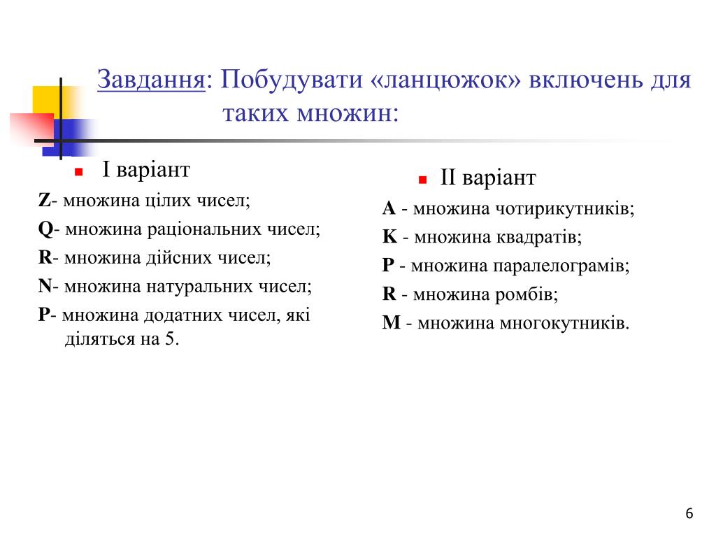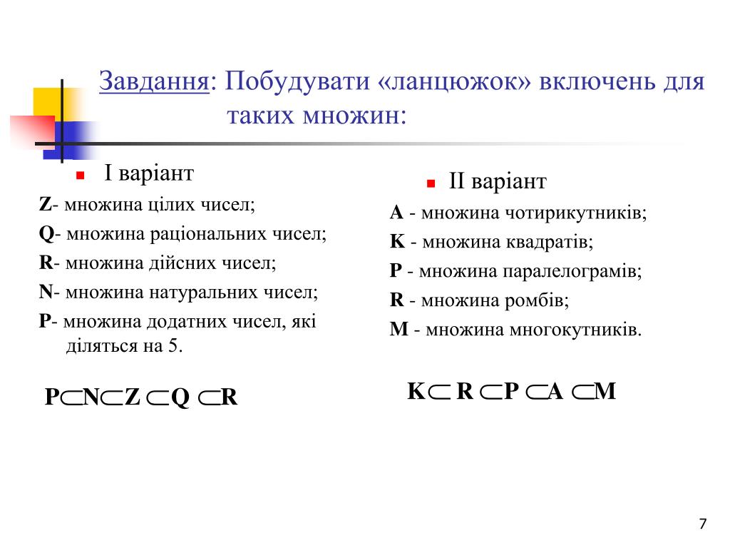 І варіант Z- множина цілих чисел; Q- множина раціональних чисел; R- множина дійсних чисел; N- множина натуральних чисел; P- множина додатних чисел, які діляться на 5. ІІ варіант A - множина чотирикутників; K - множина квадратів; P - множина паралелограмів; R - множина ромбів; M - множина многокутників. Завдання: Побудувати «ланцюжок» включень для таких множин: K R P A M P N Z Q R A M P R R K P N Z Q