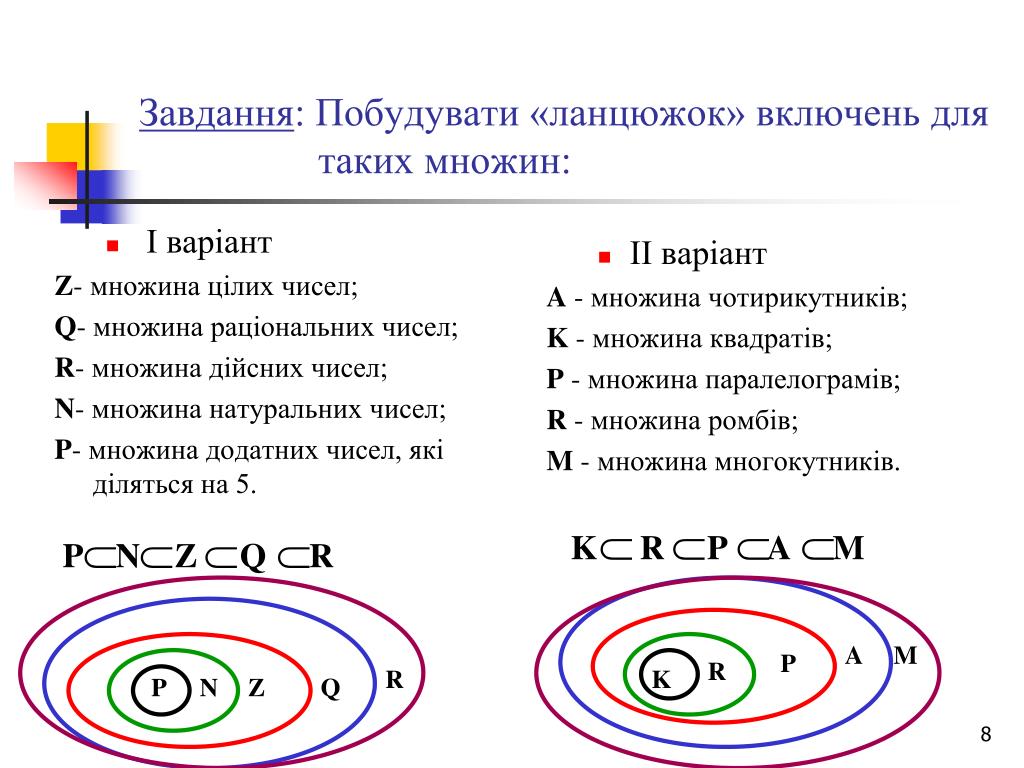 І варіант Z- множина цілих чисел; Q- множина раціональних чисел; R- множина дійсних чисел; N- множина натуральних чисел; P- множина додатних чисел, які діляться на 5. ІІ варіант A - множина чотирикутників; K - множина квадратів; P - множина паралелограмів; R - множина ромбів; M - множина многокутників. Завдання: Побудувати «ланцюжок» включень для таких множин: