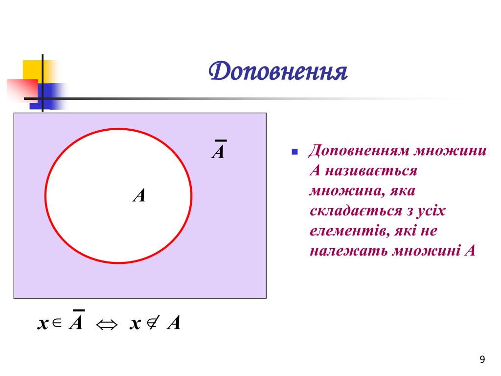 Доповненням множини А називається множина, яка складається з усіх елементів, які не належать множині А Доповнення А А х А х / А