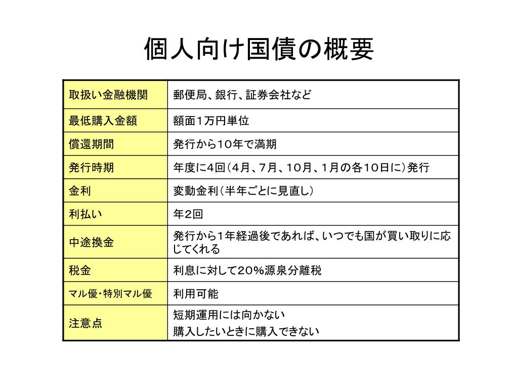 個人向け国債を上手に活用する • 1万円から買える手軽さが魅力 • 最低利率が保障された変動金利国債 • 1年経てば換金が原則自由にできる • 中長期運用向き商品である • ペイオフ対策にはもってこいの商品である