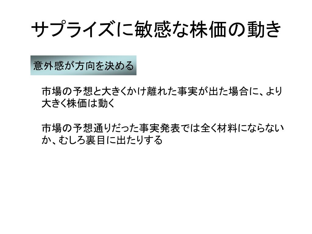 サプライズに敏感な株価の動き 意外感が方向を決める 市場の予想と大きくかけ離れた事実が出た場合に、より大きく株価は動く 市場の予想通りだった事実発表では全く材料にならないか、むしろ裏目に出たりする