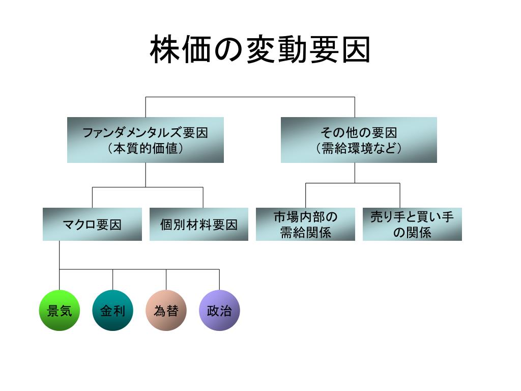 株価の変動要因 ファンダメンタルズ要因 (本質的価値) その他の要因 (需給環境など) マクロ要因 個別材料要因 市場内部の 需給関係 売り手と買い手 の関係 景気 金利 為替 政治