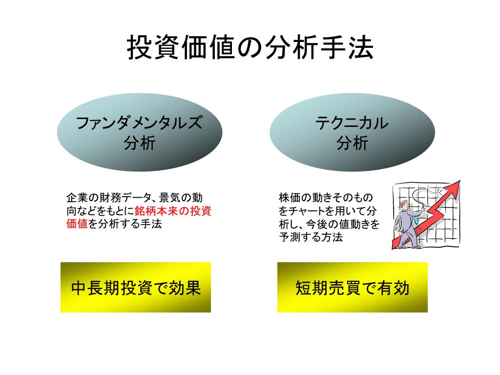 投資価値の分析手法 ファンダメンタルズ 分析 テクニカル 分析 企業の財務データ、景気の動向などをもとに銘柄本来の投資価値を分析する手法 株価の動きそのものをチャートを用いて分析し、今後の値動きを予測する方法 中長期投資で効果 短期売買で有効