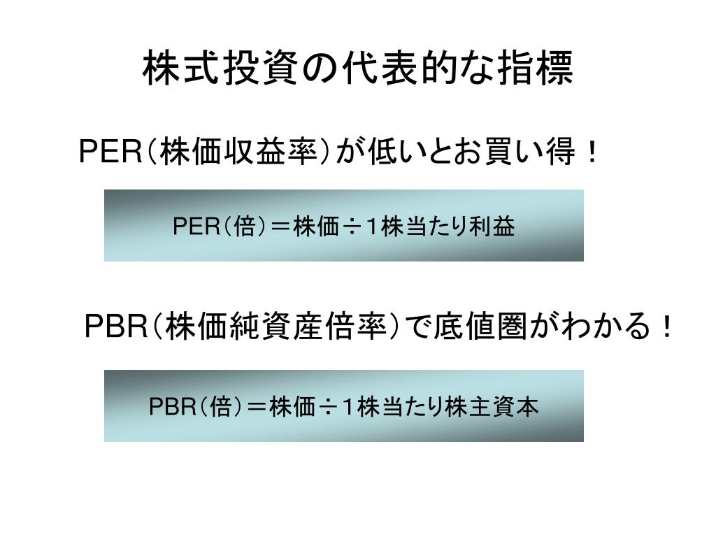 株式投資の代表的な指標 PER(株価収益率)が低いとお買い得! PER(倍)=株価÷1株当たり利益 PBR(株価純資産倍率)で底値圏がわかる! PBR(倍)=株価÷1株当たり株主資本
