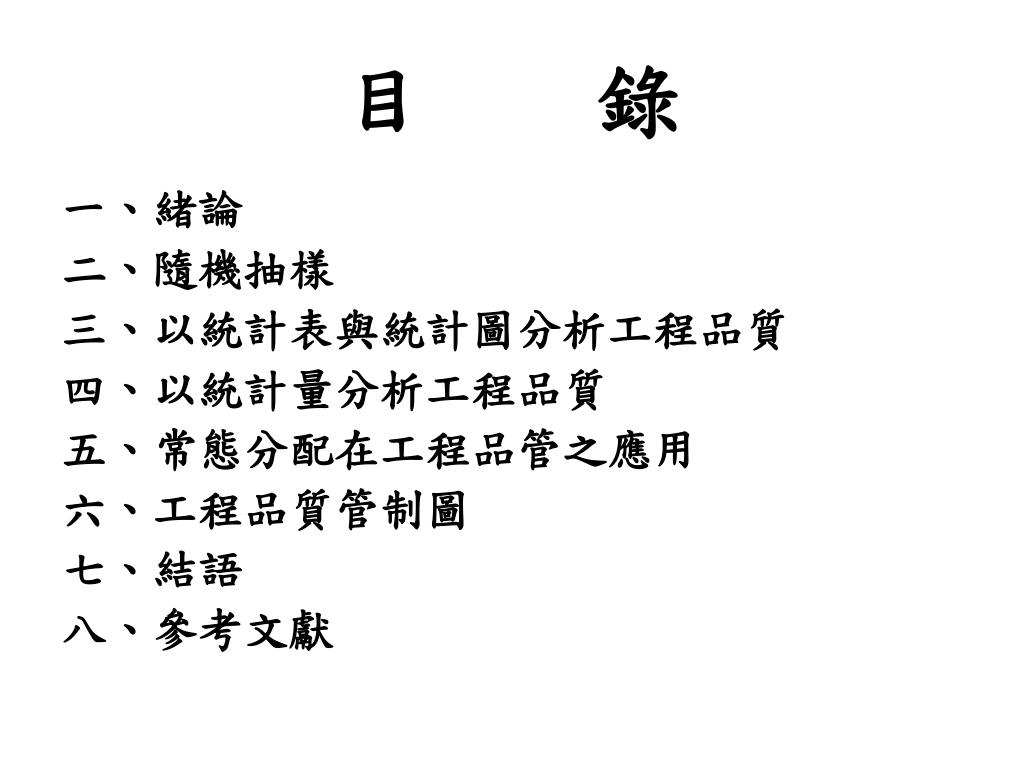 目 錄 一、緒論 二、隨機抽樣 三、以統計表與統計圖分析工程品質 四、以統計量分析工程品質 五、常態分配在工程品管之應用 六、工程品質管制圖 七、結語 八、參考文獻