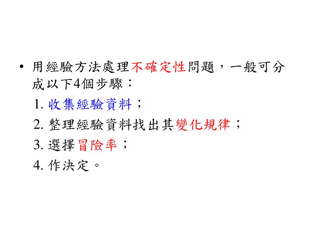 用經驗方法處理不確定性問題,一般可分成以下4個步驟:用經驗方法處理不確定性問題,一般可分成以下4個步驟: 1. 收集經驗資料; 2. 整理經驗資料找出其變化規律; 3. 選擇冒險率; 4. 作決定。