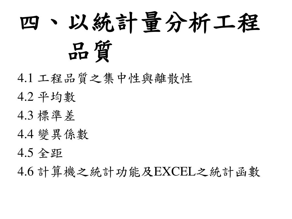 四、以統計量分析工程 品質 4.1 工程品質之集中性與離散性 4.2 平均數 4.3 標準差 4.4 變異係數 4.5 全距 4.6 計算機之統計功能及EXCEL之統計函數