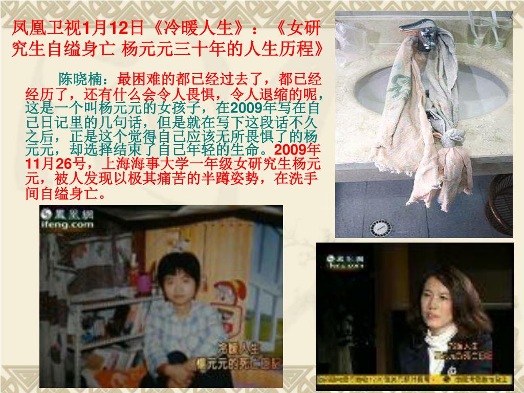凤凰卫视1月12日《冷暖人生》:《女研究生自缢身亡 杨元元三十年的人生历程》 陈晓楠:最困难的都已经过去了,都已经经历了,还有什么会令人畏惧,令人退缩的呢,这是一个叫杨元元的女孩子,在2009年写在自己日记里的几句话,但是就在写下这段话不久之后,正是这个觉得自己应该无所畏惧了的杨元元,却选择结束了自己年轻的生命。2009年11月26号,上海海事大学一年级女研究生杨元元,被人发现以极其痛苦的半蹲姿势,在洗手间自缢身亡。