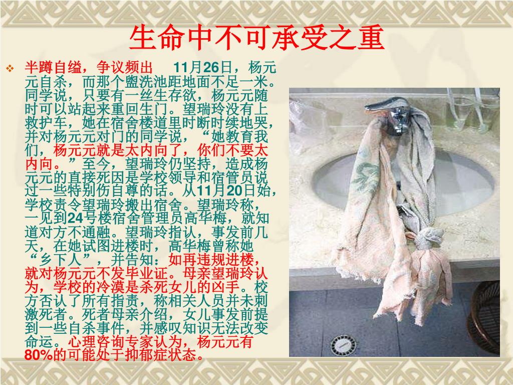 四、对教育及教育方法的反思 • 为了避免杨元元事件反复发生,让我们更好地掌握生命教育的性质与方法——用生命去涵养生命。 • 学生在学校中,不仅是在课堂里接受知识的教育,更应该在老师为人处事的态度上得到潜移默化,受到老师判断事物好坏、优劣、是非、美丑的价值观念的影响,还应该得到教师无形的人格力量的感召,接受教师观察问题、分析问题、解决问题的方式方法的训练,等等,这一切都非仅仅在课堂中完成,而是在老师与学生间亲密交往中通过生命的融通来达到。
