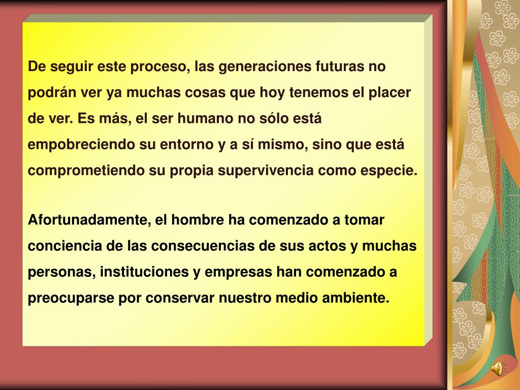 De seguir este proceso, las generaciones futuras no podrán ver ya muchas cosas que hoy tenemos el placer de ver. Es más, el ser humano no sólo está empobreciendo su entorno y a sí mismo, sino que está comprometiendo su propia supervivencia como especie. Afortunadamente, el hombre ha comenzado a tomar conciencia de las consecuencias de sus actos y muchas personas, instituciones y empresas han comenzado a preocuparse por conservar nuestro medio ambiente.