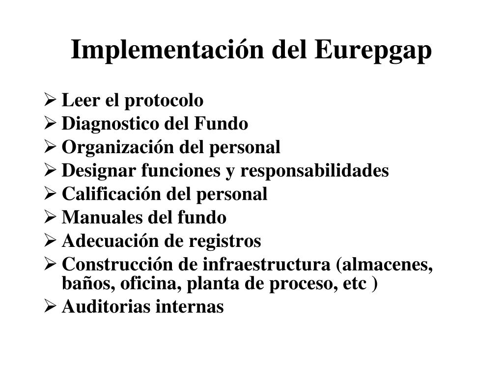 Implementación del Eurepgap • Leer el protocolo • Diagnostico del Fundo • Organización del personal • Designar funciones y responsabilidades • Calificación del personal • Manuales del fundo • Adecuación de registros • Construcción de infraestructura (almacenes, baños, oficina, planta de proceso, etc ) • Auditorias internas