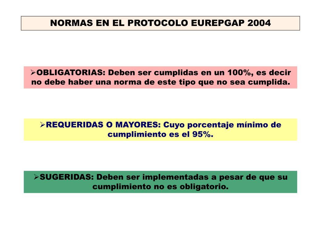 NORMAS EN EL PROTOCOLO EUREPGAP 2004 • OBLIGATORIAS: Deben ser cumplidas en un 100%, es decir no debe haber una norma de este tipo que no sea cumplida. • REQUERIDAS O MAYORES: Cuyo porcentaje mínimo de cumplimiento es el 95%. • SUGERIDAS: Deben ser implementadas a pesar de que su cumplimiento no es obligatorio.