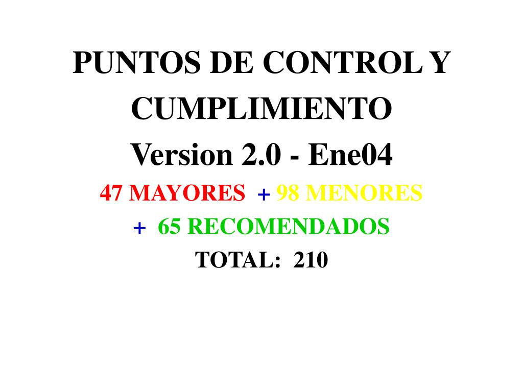 PUNTOS DE CONTROL Y CUMPLIMIENTO Version 2.0 - Ene04 47 MAYORES + 98 MENORES + 65 RECOMENDADOS TOTAL: 210