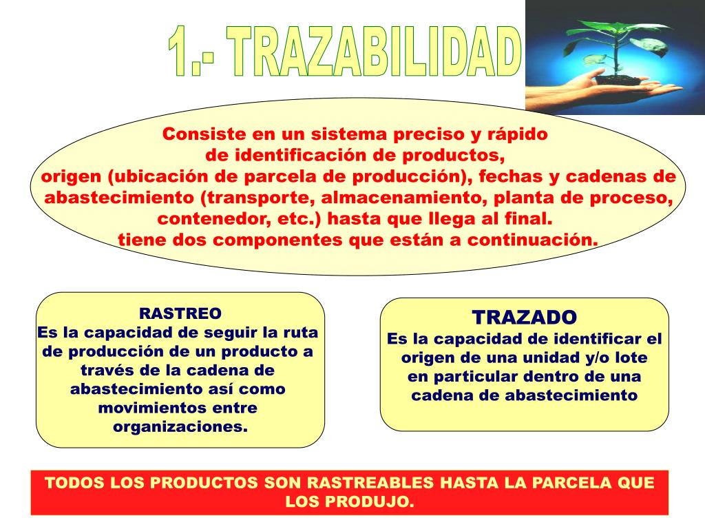 1.- TRAZABILIDAD Consiste en un sistema preciso y rápido de identificación de productos, origen (ubicación de parcela de producción), fechas y cadenas de abastecimiento (transporte, almacenamiento, planta de proceso, contenedor, etc.) hasta que llega al final. tiene dos componentes que están a continuación. RASTREO Es la capacidad de seguir la ruta de producción de un producto a través de la cadena de abastecimiento así como movimientos entre organizaciones. TRAZADO Es la capacidad de identificar el origen de una unidad y/o lote en particular dentro de una cadena de abastecimiento TODOS LOS PRODUCTOS SON RASTREABLES HASTA LA PARCELA QUE LOS PRODUJO.