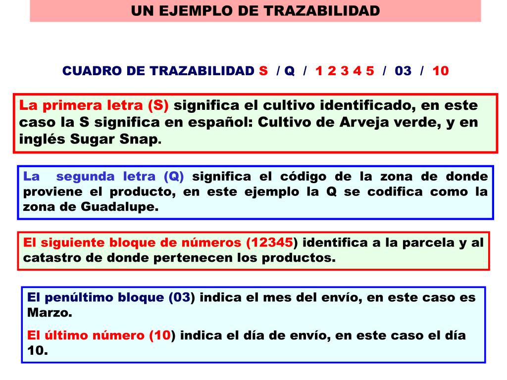 UN EJEMPLO DE TRAZABILIDAD CUADRO DE TRAZABILIDAD S / Q / 1 2 3 4 5 / 03 / 10 La primera letra (S) significa el cultivo identificado, en este caso la S significa en español: Cultivo de Arveja verde, y en inglés Sugar Snap. La segunda letra (Q) significa el código de la zona de donde proviene el producto, en este ejemplo la Q se codifica como la zona de Guadalupe. El siguiente bloque de números (12345) identifica a la parcela y al catastro de donde pertenecen los productos. El penúltimo bloque (03) indica el mes del envío, en este caso es Marzo. El último número (10) indica el día de envío, en este caso el día 10.